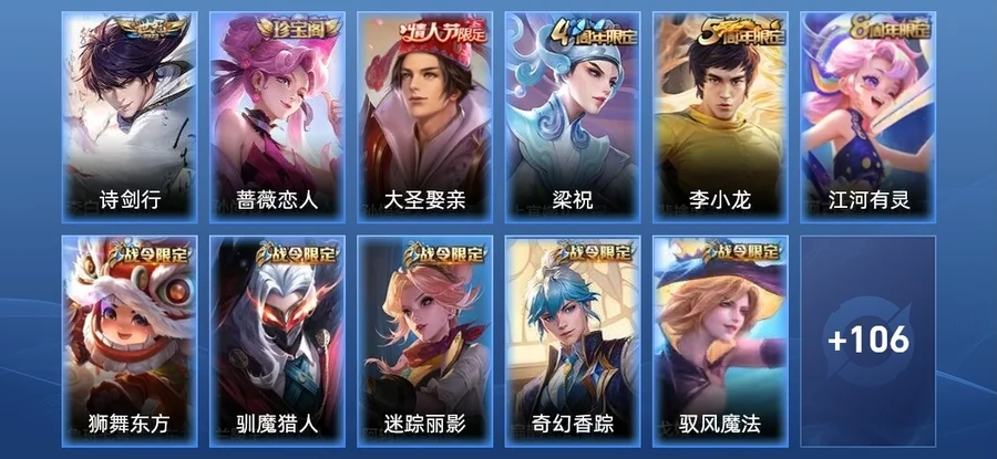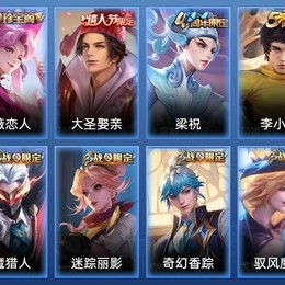 劉禪-電玩·爆裂旋風,明世隱-虹雲星官,夢奇-美夢成真,劉邦-德古拉伯爵,王昭君-幻想奇妙夜,小喬-繽紛獨角獸,哪吒-三太子,關羽-天啟騎士,大喬-守護之力,上官婉兒-修竹墨客,海月-幻泉霧影,呂布-野性能量,百里玄策-熱力迴旋,鬼谷子-幻樂之宴,李元芳-妄想特派,亞瑟-死亡騎士,安琪拉-心靈駭客,姬小滿-零食大作戰,老夫子-功夫老勺,宮本武藏-永珍初新,孫悟空-西部大鏢客,韓信-教廷特使,墨子-金屬風暴,莊周-奇妙博物學,露娜-哥特玫瑰,楊戩-次元傲視,亞連-破局者,劉備-萬事如意,趙雲-未來紀元,干將莫邪-第七人偶,甄姬-冰雪圓舞曲,魯班大師-乓乓大師,露娜-緋紅之刃,哪吒-次元突破,馬可波羅-激情綠茵,花木蘭-水晶獵龍者,韓信-白龍吟,曜-歸虛夢演,白起-星夜王子,妲己-魅力維加斯,阿軻-愛心護理,張良-繽紛繪卷,雅典娜-戰爭女神,蘭陵王-暗隱獵獸者,張良-古海尋蹤,元歌-午夜歌劇院,達摩-拳王,典韋-黃金武士,鍾無豔-聚星閃耀,盾山-圓桌騎士,孫尚香-水果甜心,劉邦-聖殿之光,狄仁傑-鷹眼統帥,花木蘭-兔女郎,海月-王牌新星,鍾無豔-海灘麗影,項羽-帝國元帥,雅典娜-冰冠公主,后羿-阿爾法小隊,劉禪-秘密基地,李白-範海辛,蘇烈-堅韌之力,呂布-聖誕狂歡,鎧-龍域領主,露娜-瓷語鑑心,小喬-萬聖前夜,李元芳-逐浪之夏,扁鵲-化身博士,妲己-女僕咖啡,蒙恬-蔚藍守將,趙雲-忍·炎影,百里玄策-威尼斯狂歡,艾琳-流音漫舞,妲己-少女阿狸