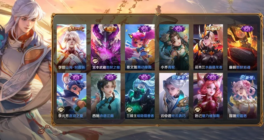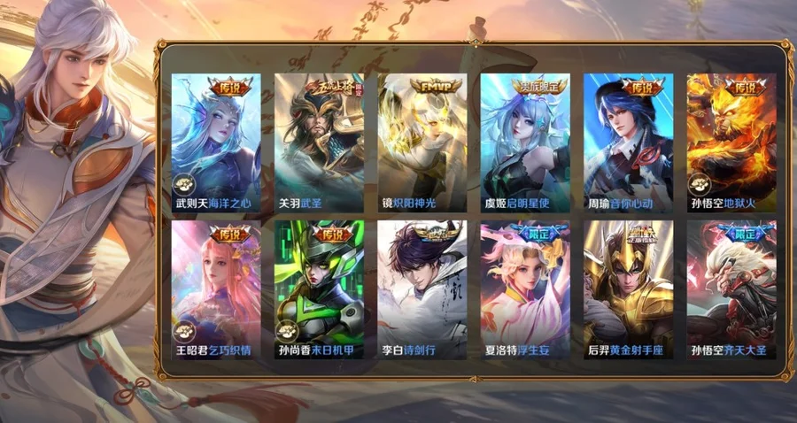 百里玄策-白虎志,關羽-武聖,李信-山海·熾霜斬,孫悟空-齊天大聖,夏洛特-浮生妄,瑤-時之祈願,虞姬-啟明星使,蘭陵王-影龍天霄