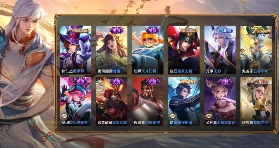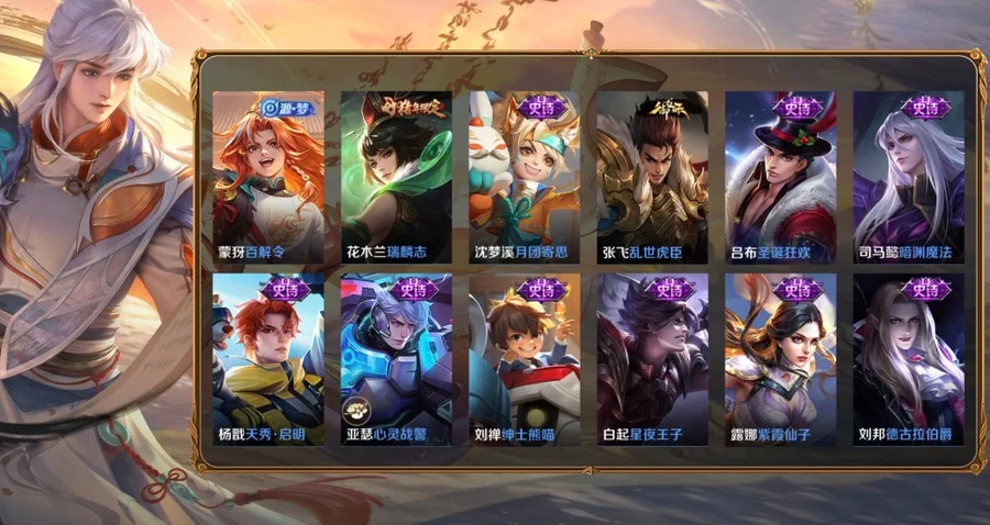 桑啟-畫中遊,阿古朵-熊喵少女,百里守約-絕影神槍,百里玄策-威尼斯狂歡,蔡文姬-薔薇王座,曹操-超能戰警,曹操-死神來了,嫦娥-露花倒影,成吉思汗-維京掠奪者,大喬-伊勢巫女,狄仁傑-錦衣衛,貂蟬-異域舞娘,東皇太一-東海龍王,盾山-極冰防禦線,暃-碧珀緋影,伽羅-花見巫女,干將莫邪-第七人偶,高漸離-金屬狂潮,公孫離-花間舞,關羽-天啟騎士,鬼谷子-阿摩司公爵,后羿-精靈王,花木蘭-劍舞者,黃忠-芝加哥教父,鏡-冰刃幻境,鎧-龍域領主,蘭陵王-隱刃,瀾-孤獵,老夫子-潮流仙人,李白-範海辛,李信-灼熱之刃,李元芳-特種部隊,劉邦-聖殿之光,劉禪-英喵野望,露娜-緋紅之刃,魯班大師-歸虛夢演,魯班七號-木偶奇遇記,魯班七號-福祿兄弟,馬超-倖存者,馬可波羅-激情綠茵,蒙恬-秩序獵龍將,蒙犽-歸虛夢演,夢奇-美夢成真,米萊狄-精準探案法,明世隱-占星師,哪吒-三太子,女媧-尼羅河女神,盤古-創世神祝,裴擒虎-街頭旋風,上官婉兒-修竹墨客,沈夢溪-棒球奇才,司空震-啟蟄,司馬懿-魘語軍師,蘇烈-愛與和平,孫臏-未來旅行,孫策-海之征途,孫悟空-西部大鏢客,太乙真人-圓桌騎士,王昭君-精靈公主,西施-歸虛夢演,夏侯惇-戰爭騎士,項羽-帝國元帥,小喬-萬聖前夜,雅典娜-戰爭女神,楊戩-埃及法老,楊玉環-霓裳曲,瑤-森,曜-歸虛夢演,弈星-踏雪尋梅,虞姬-加勒比小姐,元歌-午夜歌劇院,雲纓-赤焰之纓,雲中君-荷魯斯之眼,張良-一千零一夜,鍾馗-地府判官,鍾無豔-生化警戒,周瑜-海軍大將,諸葛亮-星航指揮官,豬八戒-年年有餘