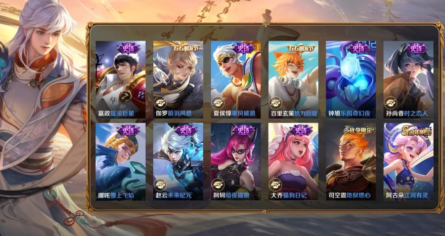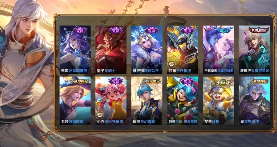 孫策-貓狗日記,阿古朵-江河有靈,司空震-地獄燃心,百里玄策-原初追逐者,雲中君-纖雲弄巧,妲己-女僕咖啡,狄仁傑-鷹眼統帥,劉禪-紳士熊喵,呂布-聖誕狂歡,扁鵲-奇幻香蹤,盤古-冰霜神祇,馬可波羅-山海·玄木吟,元歌-無心,鬼谷子-五穀豐年,趙雲-未來紀元,阿軻-暗夜貓娘,安琪拉-心靈駭客,亞瑟-心靈戰警,白起-星夜王子,百里守約-特工魅影,百里玄策-熱力迴旋,不知火舞-魅語,蔡文姬-舞動綠茵,曹操-幽靈船長,嫦娥-拒霜思,程咬金-功夫廚神,妲己-魅力維加斯,大喬-貓狗日記,狄仁傑-魔術師,貂蟬-聖誕戀歌,伽羅-箭羽風息,干將莫邪-冰霜戀舞曲,公孫離-無限星賞官,宮本武藏-鬼劍武藏,韓信-白龍吟,花木蘭-水晶獵龍者,花木蘭-青春決賽季,花木蘭-瑞麟志,橘右京-修羅,鎧-曙光守護者,蘭陵王-暗隱獵獸者,李元芳-逐浪之夏,廉頗-地獄巖魂,劉邦-德古拉伯爵,劉禪-天才門將,露娜-紫霞仙子,魯班七號-電玩小子,呂布-末日機甲,馬超-神威,墨子-金屬風暴,墨子-龍騎士,娜可露露-晚螢,哪吒-雪上飛焰,裴擒虎-天狼狩獵者,上官婉兒-梁祝,裴擒虎-李小龍,沈夢溪-月團寄思,司馬懿-暗淵魔法,孫尚香-水果甜心,孫尚香-時之戀人,王昭君-偶像歌手,西施-詩語江南,夏侯惇-乘風破浪,小喬-繽紛獨角獸,小喬-青蛇,雅典娜-冰冠公主,雅典娜-黎明之約,楊戩-天秀·啟明,嬴政-搖滾巨星,張飛-亂世虎臣,趙雲-皇家上將,甄姬-冰雪圓舞曲,鍾馗-樂園奇幻夜,諸葛亮-黃金分割率,豬八戒-豬悟能,劉禪-電玩·爆裂旋風
