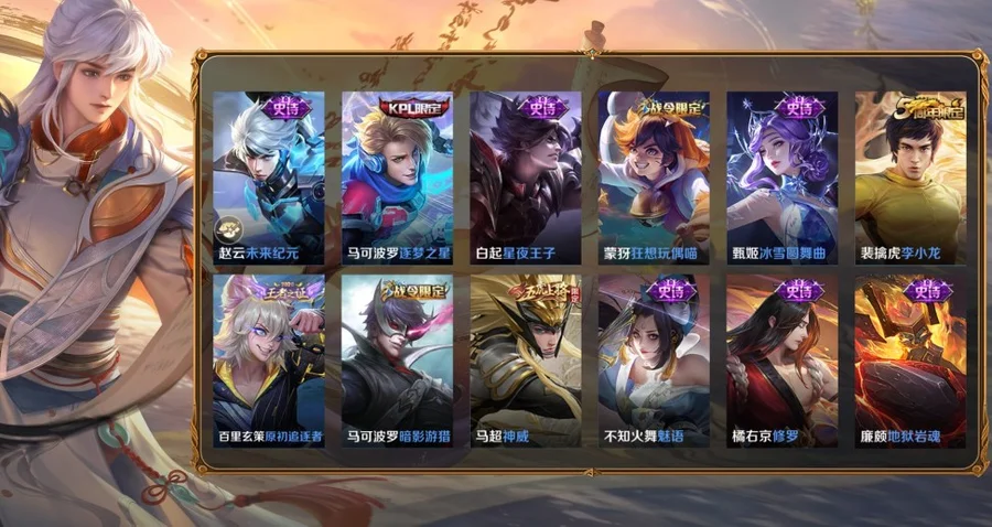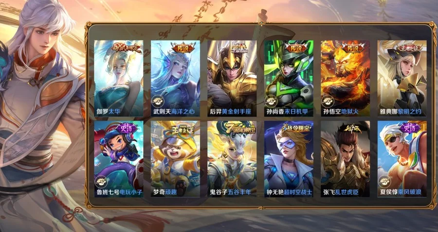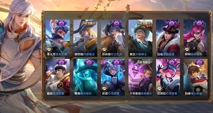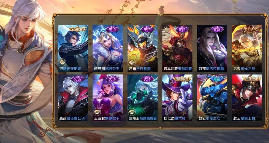桑啟-畫中遊,阿古朵-熊喵少女,百里守約-絕影神槍,百里玄策-威尼斯狂歡,蔡文姬-薔薇王座,曹操-超能戰警,曹操-死神來了,嫦娥-露花倒影,成吉思汗-維京掠奪者,大喬-伊勢巫女,狄仁傑-錦衣衛,貂蟬-異域舞娘,東皇太一-東海龍王,盾山-極冰防禦線,暃-碧珀緋影,伽羅-花見巫女,干將莫邪-第七人偶,高漸離-金屬狂潮,公孫離-花間舞,關羽-天啟騎士,鬼谷子-阿摩司公爵,后羿-精靈王,花木蘭-劍舞者,黃忠-芝加哥教父,金蟬-前塵,鏡-冰刃幻境,鎧-龍域領主,蘭陵王-隱刃,瀾-孤獵,老夫子-潮流仙人,李白-範海辛,李信-灼熱之刃,李元芳-特種部隊,劉邦-聖殿之光,劉禪-英喵野望,露娜-緋紅之刃,魯班大師-歸虛夢演,魯班七號-木偶奇遇記,魯班七號-福祿兄弟,馬超-倖存者,馬可波羅-激情綠茵,蒙恬-秩序獵龍將,蒙犽-歸虛夢演,夢奇-美夢成真,米萊狄-精準探案法,明世隱-占星師,哪吒-三太子,女媧-尼羅河女神,盤古-創世神祝,裴擒虎-街頭旋風,上官婉兒-修竹墨客,沈夢溪-棒球奇才,司空震-啟蟄,司馬懿-魘語軍師,蘇烈-愛與和平,孫臏-未來旅行,孫策-海之征途,孫悟空-西部大鏢客,太乙真人-圓桌騎士,王昭君-精靈公主,西施-歸虛夢演,夏侯惇-戰爭騎士,項羽-帝國元帥,小喬-萬聖前夜,雅典娜-戰爭女神,楊戩-埃及法老,楊玉環-霓裳曲,瑤-森,曜-歸虛夢演,弈星-踏雪尋梅,虞姬-加勒比小姐,元歌-午夜歌劇院,雲纓-赤焰之纓,雲中君-荷魯斯之眼,張良-一千零一夜,鍾馗-地府判官,鍾無豔-生化警戒,周瑜-海軍大將,諸葛亮-星航指揮官,豬八戒-年年有餘