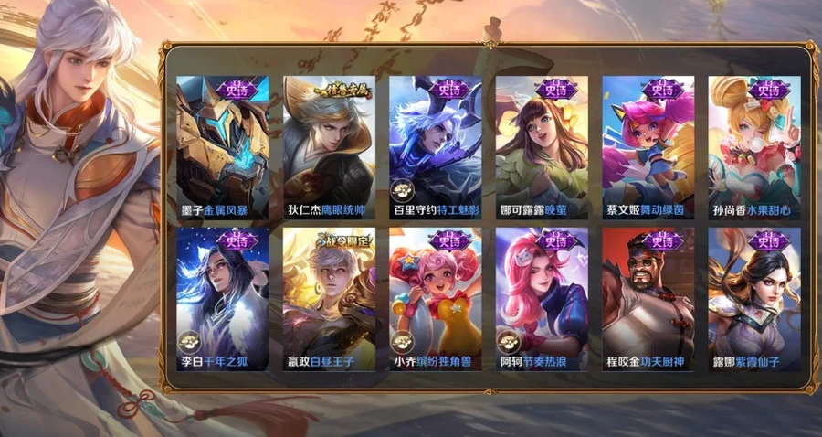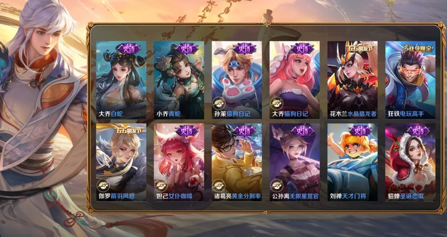 孫策-貓狗日記,百里玄策-原初追逐者,大喬-白蛇,妲己-女僕咖啡,狄仁傑-鷹眼統帥,黃忠-火炮紳士,劉禪-紳士熊喵,呂布-聖誕狂歡,鬼谷子-五穀豐年,趙雲-未來紀元,狂鐵-電玩高手,明世隱-吟遊魔法,阿軻-暗夜貓娘,阿軻-節奏熱浪,安琪拉-心靈駭客,亞瑟-心靈戰警,白起-星夜王子,百里守約-特工魅影,不知火舞-魅語,蔡文姬-舞動綠茵,曹操-幽靈船長,程咬金-功夫廚神,妲己-魅力維加斯,大喬-貓狗日記,狄仁傑-魔術師,貂蟬-聖誕戀歌,伽羅-箭羽風息,干將莫邪-真愛魔法,公孫離-無限星賞官,宮本武藏-鬼劍武藏,后羿-輝光之辰,花木蘭-水晶獵龍者,橘右京-修羅,鎧-曙光守護者,蘭陵王-暗隱獵獸者,李白-千年之狐,李元芳-逐浪之夏,廉頗-地獄巖魂,劉邦-德古拉伯爵,劉禪-天才門將,露娜-紫霞仙子,魯班七號-電玩小子,呂布-末日機甲,馬超-神威,馬可波羅-暗影遊獵,馬可波羅-逐夢之星,蒙犽-狂想玩偶喵,墨子-金屬風暴,娜可露露-晚螢,裴擒虎-李小龍,孫尚香-水果甜心,孫尚香-時之戀人,王昭君-偶像歌手,夏侯惇-乘風破浪,小喬-繽紛獨角獸,小喬-青蛇,雅典娜-冰冠公主,雅典娜-黎明之約,嬴政-搖滾巨星,嬴政-暗夜貴公子,嬴政-白晝王子,張飛-亂世虎臣,趙雲-皇家上將,趙雲-引擎之心,甄姬-冰雪圓舞曲,諸葛亮-黃金分割率