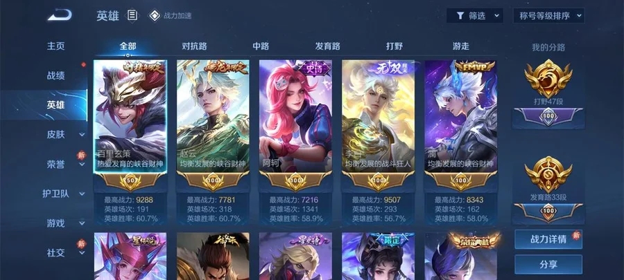 編號942:安卓v區 有二次 v9差7500到v10 全能大師 369皮 24傳說 無雙李白 4水 4星紫瑤 有靈寶*打野47段*對抗30段*中路28段*遊走28段*發育路33段