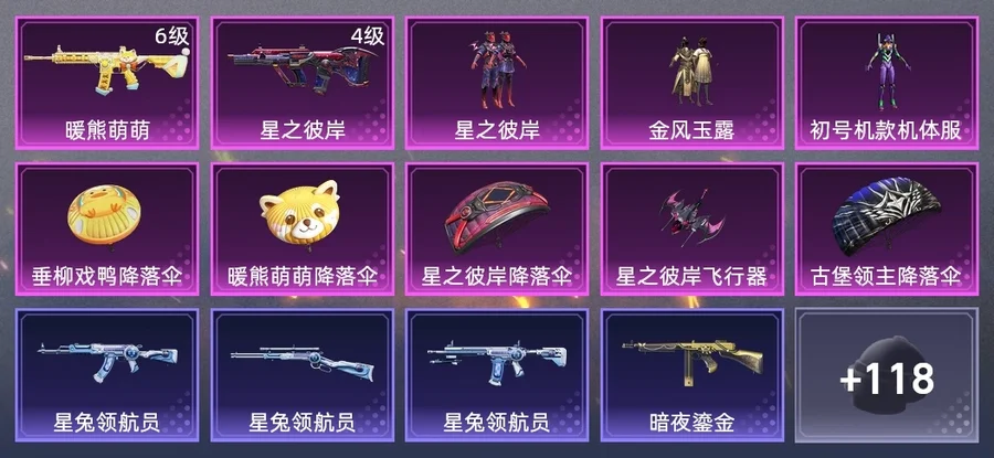 G36C-時空追擊者,Win94-星兔領航員,SPAS-12-田園牧歌,AWM-垂柳戲鴨,AC-VAL-甜心亞夢,S12K-瑞龍福將,GROZA-銀河戰甲,Mini14-耀粉歌者,M416-暖熊萌萌,SLR-嬌憨豬豬,AUG-星之彼岸,P90-飛馳魅影,DBS-甜心亞夢,AKM-奇異狩獵者,M249-鐳射皇者,AUG-炫光貝貝,M762-瑞龍福將,SKS-時空追擊者,AUG-耀粉歌者,蜜獾-嬌憨豬豬,DP-28-甜心亞夢,M16A4-甜心亞夢,M762-拳皇97,M16A4-機械英豪,VSS-鐳射皇者,S12K-暖熊萌萌,AKM-萌趣顏糰子,S1897-鐳射皇者,UZI-嬌憨豬豬,湯姆遜-銀刃賽羅,Win94-機械英豪,湯姆遜-耀粉歌者,Win94-瑞龍福將,SCAR-L-王牌四分衛,MG3-暗夜行者,G36C-暗夜玫瑰,S1897-炫光貝貝,Vector-田園牧歌,AKM-環太平洋,GROZA-田園牧歌,M762-鐳射皇者,S12K-嬌憨豬豬,Mini14-旋轉彩虹,M249-星之彼岸,野牛-機械英豪,MG3-青空秋雨,MG3-瑞龍福將,S1897-飛馳魅影,DBS-時空追擊者,M249-百萬伏特,AKM-星兔領航員,Kar98K-飛馳魅影,AKM-星之彼岸,SKS-浪客戰士,M417-星兔領航員,UMP45-怪獸之王,UMP45-時空追擊者,M762-暖熊萌萌,VSS-田園牧歌,S12K-機械英豪,湯姆遜-暗夜鎏金,VSS-星之彼岸,QBZ-飛馳魅影,M249-拳皇97