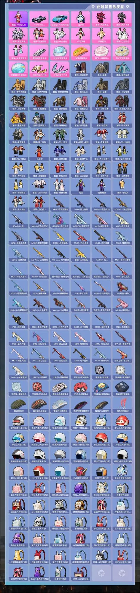 UMP45-仲夏莫吉托,湯姆遜-耀粉歌者,S686-奇異狩獵者,S686-白勺歌姬,SKS-焦糖拿鐵,M24-奇異狩獵者,M200-仲夏莫吉托,MG3-妙紅點點,莫辛納甘-懵萌河馬,S12K-焦糖拿鐵,M762-奇異狩獵者,M24-仲夏莫吉托,Mini14-耀粉歌者,QBU-全功率超戰,GROZA-懵萌河馬,DBS-粉櫻探戈,M249-妙紅點點,DBS-第五大道,Win94-粉櫻探戈,AKM-奇異狩獵者,莫辛納甘-銀碳小老虎,QBZ-銀碳小老虎,AMR-妙紅點點,DBS-聖光天使,AUG-耀粉歌者,AUG-聖光天使,MG3-第五大道,G36C-冷魅冰騎,湯姆遜-奇異狩獵者,DP-28-古戰神甲,SCAR-L-銀碳小老虎,Mk47-妙紅點點,G36C-懵萌河馬,MG3-甜心娃娃,PKM-懵萌河馬,AKM-星之信仰,MP5K-颯粉甜心,TMP-9-未來歌姬