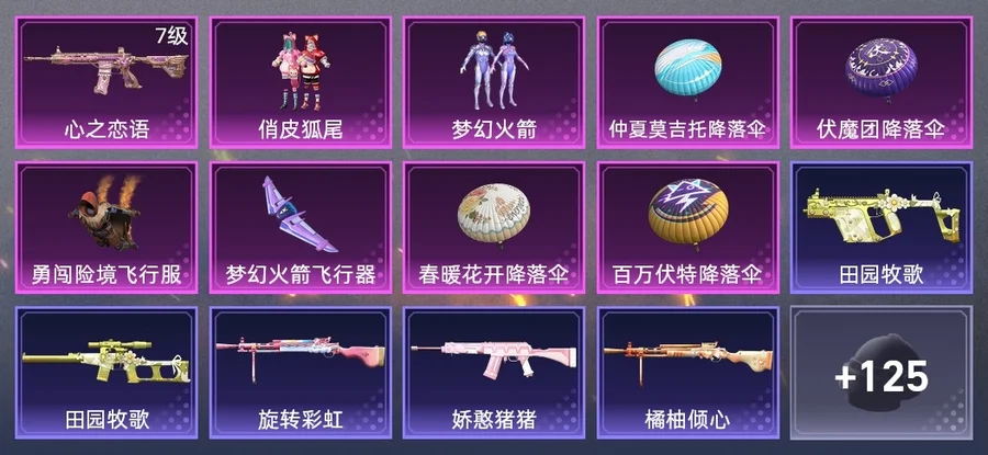 MG3-驚鴻俠骨,QBZ-原初聖火,QBZ-詭娃娃,M762-緋紅前夜,M249-古堡領主,AUG-青春冒險家,QBU-不夜海上花,S12K-香水檸檬,Kar98K-夢幻火箭,M24-治癒之星,AKM-春暖花開,M416-倉鼠灰灰,M416-心之戀語,Vector-PEL轟鳴競夢者,UZI-古堡領主,M416-緋紅前夜,M249-鐳射皇者,Mini14-春暖花開,S686-不夜海上花,SKS-勇闖險境,Mini14-銀河戰甲,Mini14-原初聖火,DP-28-旋轉彩虹,M762-拳皇97,Kar98K-勇闖險境,M16A4-機械英豪,VSS-鐳射皇者,SCAR-L-繁花小夜曲,野牛-青春冒險家,GROZA-治癒之星,SLR-眾神之王,S1897-鐳射皇者,M762-詭娃娃,S1897-勇闖險境,AKM-四聖煥新,Win94-機械英豪,S1897-神秘黑貓,G36C-不夜海上花,Kar98K-終極賽羅,VSS-荒野獵神,M417-驚鴻俠骨,VSS-深山詭影,DP-28-橘柚傾心,Vector-治癒之星,VSS-黑色刀鋒,Mk14-治癒之星,UMP45-春暖花開,Vector-田園牧歌,DP-28-原初聖火,M762-鐳射皇者,UMP45-詭娃娃,S12K-嬌憨豬豬,野牛-機械英豪,湯姆遜-勇闖險境,VSS-粉色回憶,MP5K-眾神之王,SKS-未來歌姬,S1897-百萬伏特,QBU-青春冒險家,M24-眾神之王,M249-百萬伏特,GROZA-黑色刀鋒,AWM-不夜海上花,SKS-詭娃娃,UZI-眾神之王,AKM-繽紛海域,VSS-田園牧歌,S12K-機械英豪,Mini14-夢幻火箭,GROZA-春暖花開,Vector-黑色刀鋒,M249-拳皇97