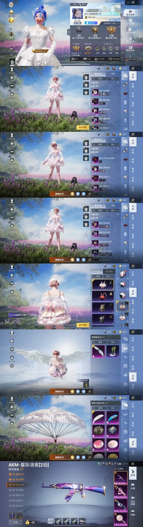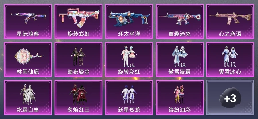 平底鍋-林間仙鹿,AKM-星際浪客,M416-心之戀語,Vector-環太平洋,GROZA-旋轉彩虹,SCAR-L-童趣迷兔