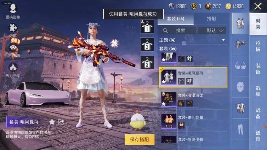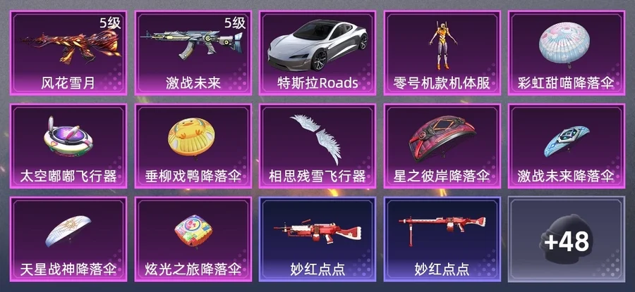 MG3-驚鴻俠骨,P90-甜蜜旋律,湯姆遜-耀粉歌者,DBS-時空追擊者,M762-激戰未來,AMR-妙紅點點,QBU-青春冒險家,MG3-妙紅點點,M417-驚鴻俠骨,SKS-時空追擊者,UZI-影襲,GROZA-黑色刀鋒,AUG-青春冒險家,DP-28-相思殘雪,M416-風花雪月,S12K-垂柳戲鴨,野牛-青春冒險家,M249-妙紅點點,PKM-拂曉神騎,M200-驚鴻俠骨,AKM-萌趣顏糰子,QBU-颯粉甜心,M24-拂曉神騎