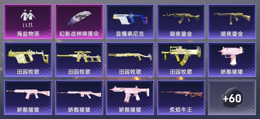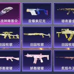 UZI-嬌憨豬豬,SPAS-12-田園牧歌,Vector-音爆索尼克,湯姆遜-耀粉歌者,Win94-瑞龍福將,湯姆遜-異彩先驅,AC-VAL-甜心亞夢,S12K-瑞龍福將,G36C-暗夜玫瑰,AWM-炙焰牛王,S12K-幻影戰神,GROZA-異彩先驅,Mini14-耀粉歌者,Vector-田園牧歌,GROZA-田園牧歌,S12K-嬌憨豬豬,SLR-嬌憨豬豬,P90-飛馳魅影,DBS-甜心亞夢,GROZA-影襲,MG3-瑞龍福將,S1897-飛馳魅影,M762-瑞龍福將,UZI-影襲,AUG-耀粉歌者,Kar98K-飛馳魅影,蜜獾-嬌憨豬豬,MP5K-異彩先驅,UMP45-時空追擊者,DP-28-甜心亞夢,M16A4-甜心亞夢,AKM-繽紛海域,Mini14-異彩先驅,M762-暗夜鎏金,AKM-恐龍拽拽,VSS-田園牧歌,湯姆遜-暗夜鎏金,QBZ-飛馳魅影