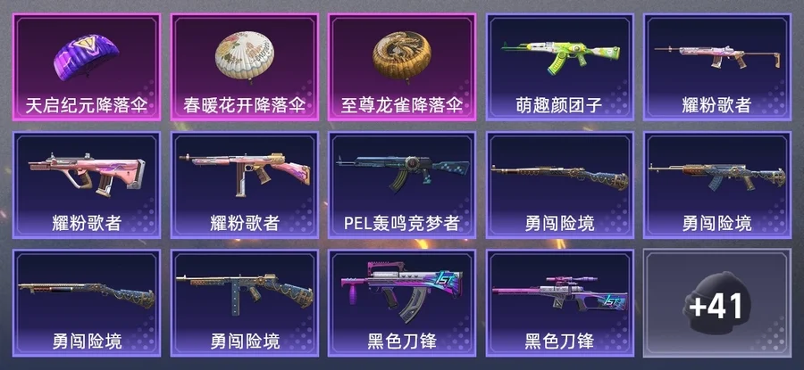 QBZ-詭娃娃,湯姆遜-耀粉歌者,UMP45-荒野獵神,VSS-荒野獵神,VSS-黑色刀鋒,M24-未來戰士,Mini14-耀粉歌者,UMP45-詭娃娃,S1897-春暖花開,G36C-荒野獵神,湯姆遜-勇闖險境,VSS-粉色回憶,Mini14-春暖花開,AKM-PEL轟鳴競夢者,SKS-勇闖險境,GROZA-黑色刀鋒,AUG-耀粉歌者,SKS-詭娃娃,M762-拳皇97,Kar98K-勇闖險境,S686-未來戰士,AKM-萌趣顏糰子,GROZA-春暖花開,M762-詭娃娃,Vector-黑色刀鋒,S1897-勇闖險境,M249-拳皇97