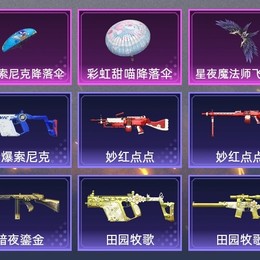 UZI-嬌憨豬豬,SPAS-12-田園牧歌,Vector-音爆索尼克,湯姆遜-耀粉歌者,M416-五爪金龍,AMR-妙紅點點,MG3-妙紅點點,AC-VAL-甜心亞夢,AWM-音爆索尼克,AUG-耀粉歌者,蜜獾-嬌憨豬豬,Vector-田園牧歌,DP-28-甜心亞夢,GROZA-田園牧歌,M16A4-甜心亞夢,S12K-嬌憨豬豬,VSS-田園牧歌,SLR-嬌憨豬豬,Mk47-妙紅點點,莫辛納甘-炙焰牛王,湯姆遜-暗夜鎏金,M249-妙紅點點,AC-VAL-彩虹甜喵,DBS-甜心亞夢