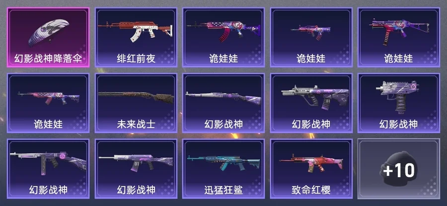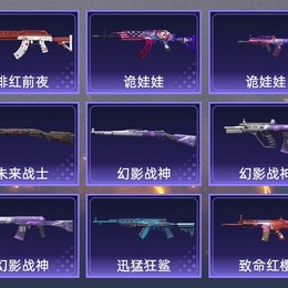 UZI-幻影戰神,SCAR-L-致命紅櫻,QBZ-詭娃娃,SKS-迅猛狂鯊,M762-緋紅前夜,S12K-幻影戰神,SKS-詭娃娃,Kar98K-幻影戰神,AUG-幻影戰神,UMP45-詭娃娃,湯姆遜-幻影戰神,S686-未來戰士,M762-詭娃娃