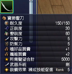 寶 飾 彎 刀 ( 耐久150,變裝60,嗜好+1,纖維+2,練成技能促進r5)
