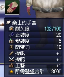 樂 士 手 套( 工藝+1,操帆+1,操舵+1,耐久100 )