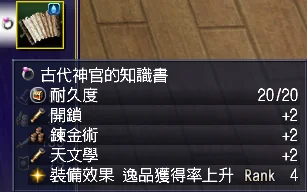古代神官的 知 識 書 ( 鍊金+2,開鎖+2,天文+2,逸品入手率上升r4)