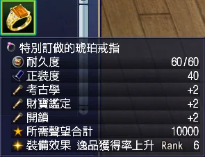 特別訂做的琥珀戒指( 開鎖+2,財寶+2,考古+2,逸品入手率上升r6)