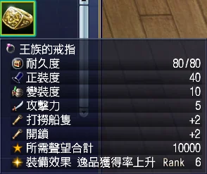 王 族 的 戒 指 ( 開鎖+2,打撈+2, 耐久80,逸品入手率上升r6)
