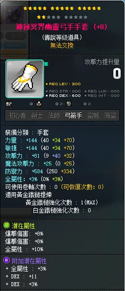 神秘弓手手套 > 雙爆+10全屬/17星/r捲/附加稀有兩排 > 2000$(售出)