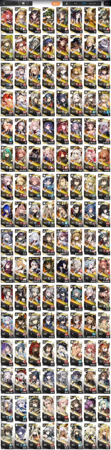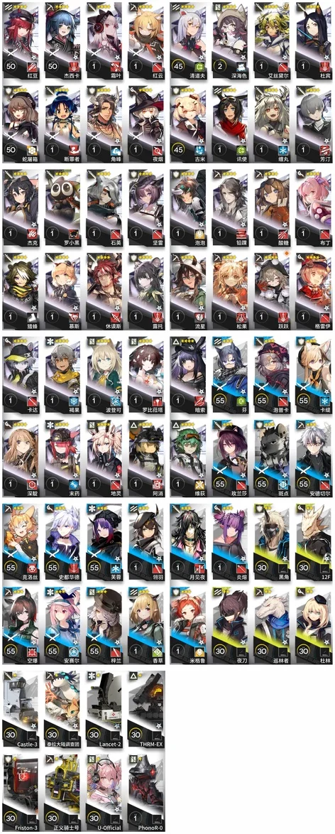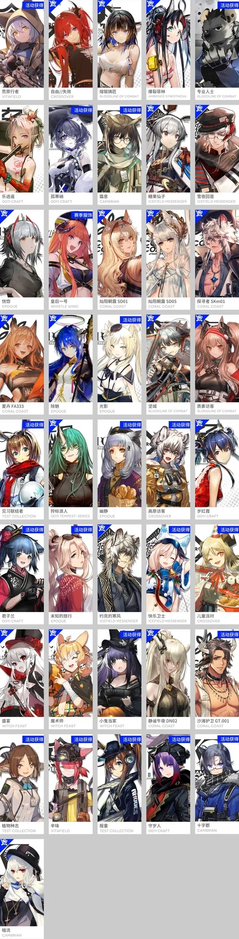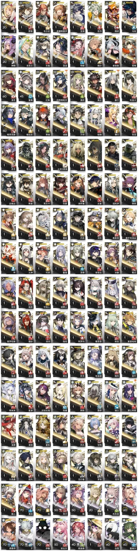 焰尾,森蚺,霍爾海雅,焰影葦草,史爾特爾,安潔莉娜,鐧,阿斯卡綸,塞雷婭,重嶽,夜鶯,夕,歸溟幽靈鯊,林,鴻雪,凱爾希,塑心,瑕光,仇白,伊芙利特,靈知,風笛,鈴蘭,薇薇安娜,琳琅詩懷雅,赫拉格,銀灰,假日威龍陳,伺夜,迷迭香,號角,琴柳,淬羽赫默,帕拉斯,斯卡蒂,刻俄柏,緘默德克薩斯,歌蕾蒂婭,阿,多蘿西,麥哲倫,星熊,陳,卡涅利安,煌,艾雅法拉,黑,嵯峨,老鯉,耀騎士臨光,W,水月,閃靈,能天使,推進之王,流明,純燼艾雅法拉,空弦,莫斯提馬,令,早露,聖約送葬人,澄閃,萊伊,斥罪,泥岩,白鐵,異客,提豐,遠牙,止頌,黑鍵,棘刺,伊內絲,山,灰燼,濁心斯卡蒂,溫蒂,年,繆爾賽思,菲亞梅塔,傀影,麒麟R夜刀,瑪恩納,艾麗妮,百鍊嘉維爾