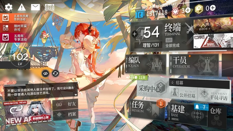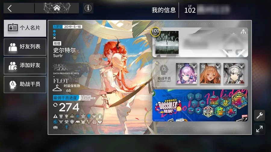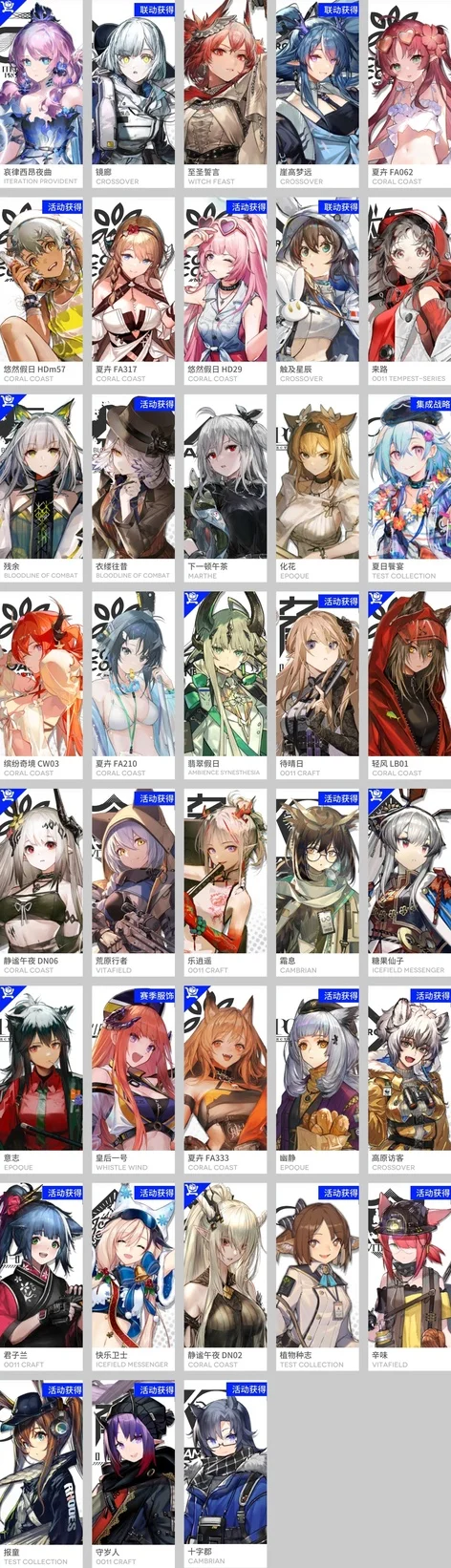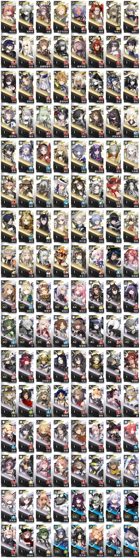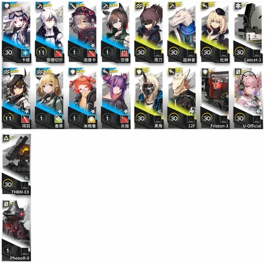 邏各斯,森蚺,霍爾海雅,史爾特爾,鐧,阿斯卡綸,塞雷婭,夜鶯,夕,鴻雪,凱爾希,伊芙利特,靈知,風笛,鈴蘭,薇薇安娜,銀灰,伺夜,號角,淬羽赫默,刻俄柏,緘默德克薩斯,歌蕾蒂婭,阿,麥哲倫,星熊,陳,煌,黑,嵯峨,老鯉,水月,閃靈,能天使,推進之王,純燼艾雅法拉,令,早露,聖約送葬人,泥岩,遠牙,止頌,棘刺,山,溫蒂,年,繆爾賽思,菲亞梅塔,瑪恩納,百鍊嘉維爾