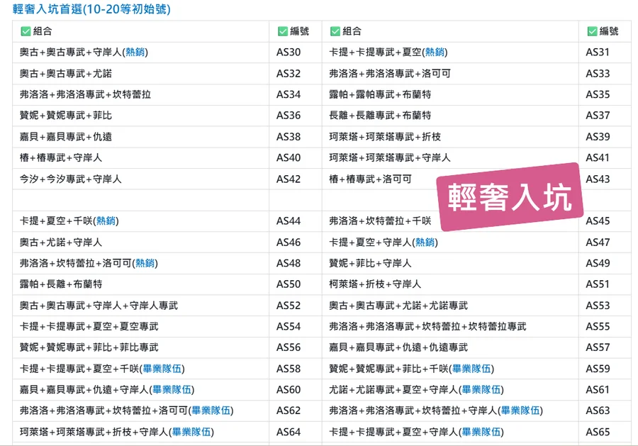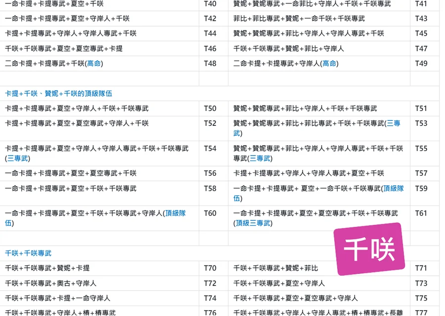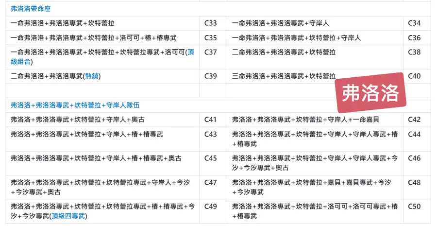 | A133 | 一命弗洛洛+弗洛洛專武+坎特蕾拉+坎特蕾拉專武+千咲+千咲專武+嘉貝+嘉貝專武+仇遠+仇遠專武(頂級組合A) | A134 | 弗洛洛+弗洛洛專武+洛可可+守岸人+千咲+千咲專武 |
