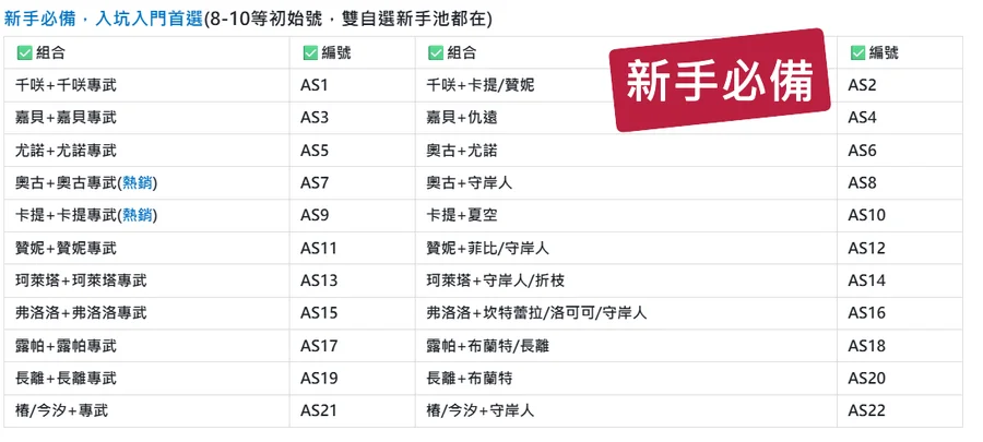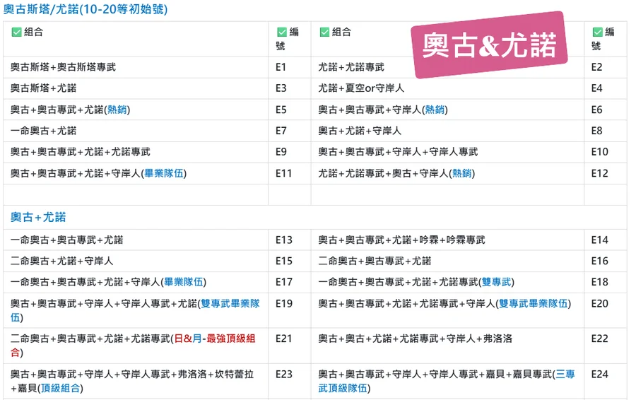 | 奧古+奧古專武+守岸人+守岸人專武 | AS52 | 奧古+奧古專武+尤諾+尤諾專武 | AS53 |