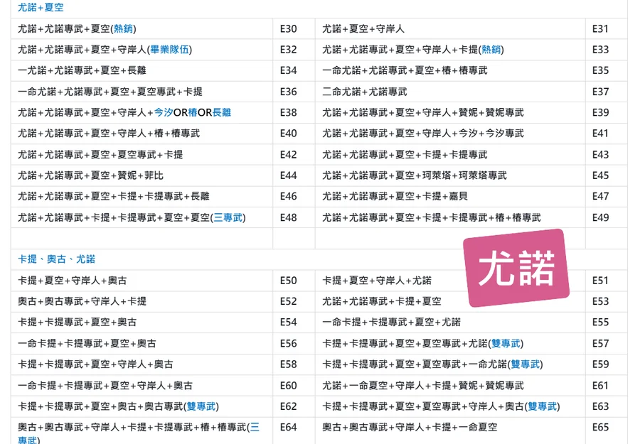 | A76 | 一命尤諾+尤諾專武+夏空+夏空專武+嘉貝莉娜+嘉貝專武+6000石頭(三專武頂級組合) | A77 | 三命奧古+奧古專武+尤諾+守岸人+千咲+千咲專武(頂級組合) |