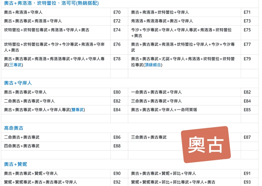 | A72 | 奧古+奧古專武+尤諾+尤諾專武+嘉貝+嘉貝專武+露帕+露帕專武(四專武) | A73 | 奧古+尤諾+尤諾專武+夏空+夏空專武+24000石頭(頂級組合) |