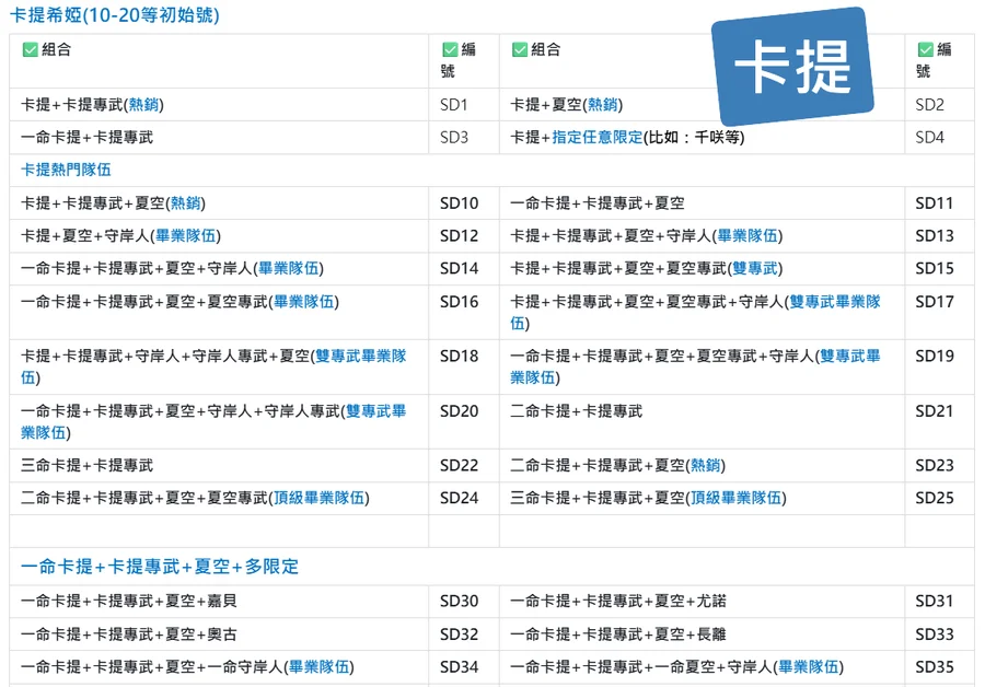 | 卡提+卡提專武+守岸人+守岸人專武+夏空+椿(畢業隊伍) | SD76 | 卡提+卡提專武+守岸人+夏空+椿+椿專武(畢業隊伍) | SD78 |