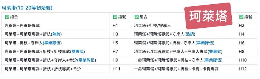 | 珂萊塔+珂萊塔專武 | H1 | 珂萊塔+折枝/守岸人 | H2 |