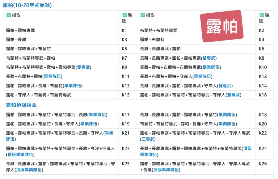 | A118 | 二命珂萊塔+珂萊塔專武+折枝+二命守岸人(頂級畢業隊伍) | A119 | 露帕+露帕專武+布蘭特+布蘭特專武+一命守岸人+守岸人專武(三專武) |