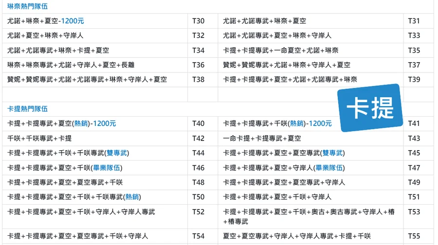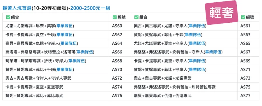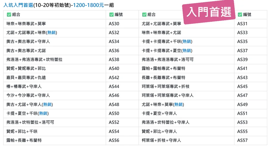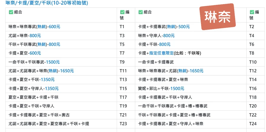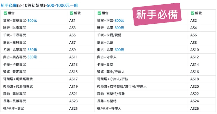 | A48 | 卡提+卡提專武+嘉貝+嘉貝專武+尤諾+尤諾專武+守岸人+守岸人專武(頂級組合) | A49 | 卡提+卡提專武+夏空+守岸人+琳奈+琳奈專武-1000元 |