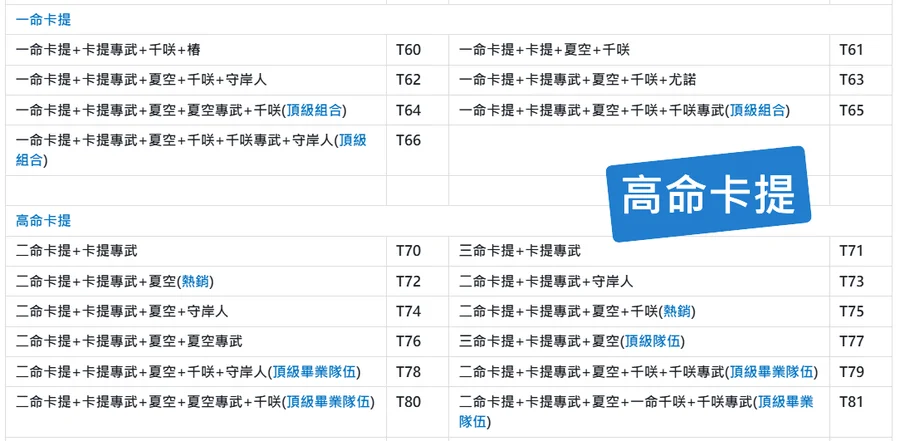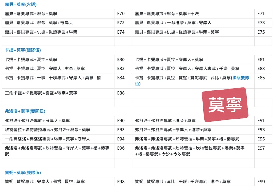 | A54 | 二命卡提+卡提專武+夏空+奧古+奧古專武 | A55 | 二命卡提+卡提專武+夏空+千咲+弗洛洛+弗洛洛專武+洛可可+守岸人(頂級畢業隊伍) |
