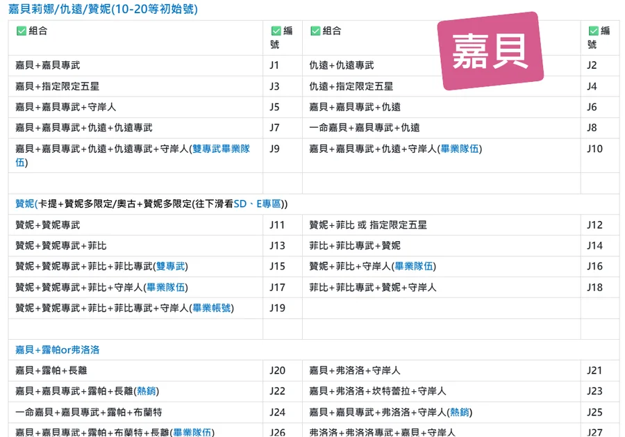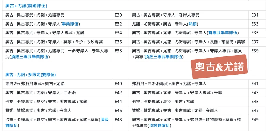 | A34 | 二命奧古+奧古專武+尤諾+尤諾專武+守岸人+嘉貝+嘉貝專武+莫寧(頂級組合) | A35 | 二命奧古+奧古專武+尤諾+守岸人+二命千咲+千咲專武 |