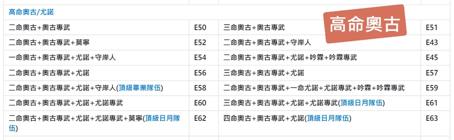 | A30 | 一命奧古+奧古專武+尤諾+守岸人+長離+長離專武+布蘭特+布蘭特專武 | A31 | 奧古+奧古專武+尤諾+尤諾專武+夏空+夏空專武+莫寧+13000石頭(頂級組合) |