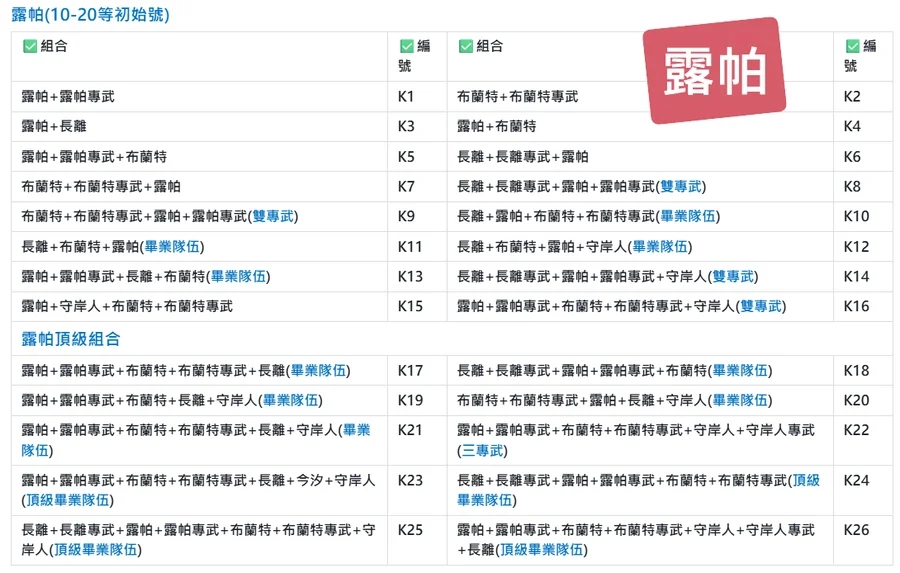 | 露帕+露帕專武+布蘭特+布蘭特專武+長離+守岸人(畢業隊伍) | K21 | 露帕+露帕專武+布蘭特+布蘭特專武+守岸人+守岸人專武(三專武) | K22 |