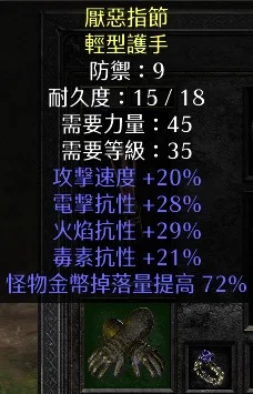 手套:20%攻擊速度28電抗29火抗21毒抗72錢黃手套 250
