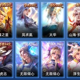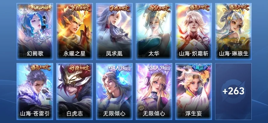 王昭君-永恆水手月亮,狄仁傑-夜禮服假面,夏洛特-浮生妄,花木蘭-燃星之曲,干將莫邪-畫中仙,項羽-無限傾心,虞姬-無限傾心,伽羅-熾翼輝光,孫悟空-齊天大聖,曜-山海·蒼雷引,小喬-山海·琳琅生,李信-山海·熾霜斬,虞姬-啟明星使,百里玄策-白虎志,伽羅-太華,楊戩-永曜之星,李白-鳳求凰,呂布-天魔繚亂