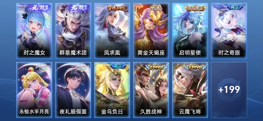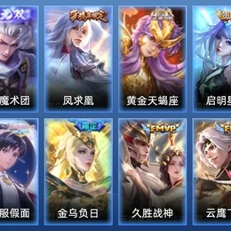 瑤-遇見神鹿,李元芳-妄想特派,瑤-森,孫尚香-時之戀人,瀾-孤獵,鏡-冰刃幻境,安琪拉-時之奇旅,伽羅-花見巫女,成吉思汗-維京掠奪者,劉備-潮玩造夢師,曹操-幽靈船長,羋月-紅桃皇后,典韋-黃金武士,劉邦-聖殿之光,孫臏-天使之翼,劉禪-秘密基地,程咬金-無雙福將,公孫離-花間舞,弈星-踏雪尋梅,呂布-野性能量,西施-詩語江南,花木蘭-兔女郎,張良-繽紛繪卷,豬八戒-潮玩探月行,桑啟-畫中遊,嬴政-暗夜貴公子,狂鐵-特工戰影,司空震-啟蟄,諸葛亮-星航指揮官,百里守約-特工魅影,上官婉兒-修竹墨客,不知火舞-魅語,呂布-末日機甲,李元芳-特種部隊,劉禪-喚靈魔甲,雲纓-赤焰之纓,小喬-繽紛獨角獸,張良-古海尋蹤,黃忠-芝加哥教父,孫尚香-水果甜心,劉禪-紳士熊喵,孫策-貓狗日記,程咬金-功夫廚神,虞姬-加勒比小姐,蒙恬-蔚藍守將,甄姬-冰雪圓舞曲,雅典娜-冰冠公主,魯班大師-乓乓大師,妲己-女僕咖啡,魯班七號-電玩小子,女媧-尼羅河女神,橘右京-修羅,裴擒虎-街頭旋風,嫦娥-露花倒影,曜-歸虛夢演,白起-星夜王子,廉頗-無盡征程,白起-白色死神,墨子-金屬風暴,盾山-圓桌騎士,趙雲-未來紀元,干將莫邪-第七人偶,盤古-創世神祝,劉備-紐約教父,達摩-大發明家,關羽-天啟騎士,哪吒-次元突破,劉備-漢昭烈帝,司馬懿-魘語軍師,花木蘭-水晶獵龍者,姜子牙-熾熱元素使,劉邦-德古拉伯爵,公孫離-無限星賞官,阿軻-節奏熱浪,沈夢溪-鯊炮海盜貓,諸葛亮-黃金分割率,孫臏-歸虛夢演,張飛-五福同心,鬼谷子-幻樂之宴,狄仁傑-鷹眼統帥,百里玄策-威尼斯狂歡,宮本武藏-永珍初新,小喬-丁香結,蘇烈-堅韌之力,花木蘭-劍舞者,李信-灼熱之刃,莊周-奇妙博物學,阿軻-愛心護理,鍾馗-地府判官,夏侯惇-乘風破浪,蘭陵王-暗隱獵獸者,呂布-聖誕狂歡,豬八戒-年年有餘,張良-幽蘭居士,安琪拉-玩偶對對碰,明世隱-虹雲星官,李白-千年之狐,孫悟空-西部大鏢客,李白-範海辛,項羽-科學大爆炸,蘭陵王-隱刃,盾山-極冰防禦線,達摩-拳王,鎧-曙光守護者,扁鵲-化身博士,李白-敏銳之力,諸葛亮-掌控之力,宮本武藏-霸王丸,老夫子-功夫老勺,孫策-海之征途,劉備-萬事如意,韓信-教廷特使,王昭君-幻想奇妙夜,楊玉環-霓裳曲,安琪拉-心靈駭客,鍾無豔-海灘麗影,曹操-死神來了,大喬-伊勢巫女,嬴政-搖滾巨星,貂蟬-聖誕戀歌,韓信-白龍吟,露娜-紫霞仙子,馬可波羅-激情綠茵,小喬-萬聖前夜,王昭君-精靈公主,韓信-街頭霸王,露娜-緋紅之刃,趙雲-白執事,妲己-少女阿狸,孫臏-未來旅行,亞瑟-死亡騎士