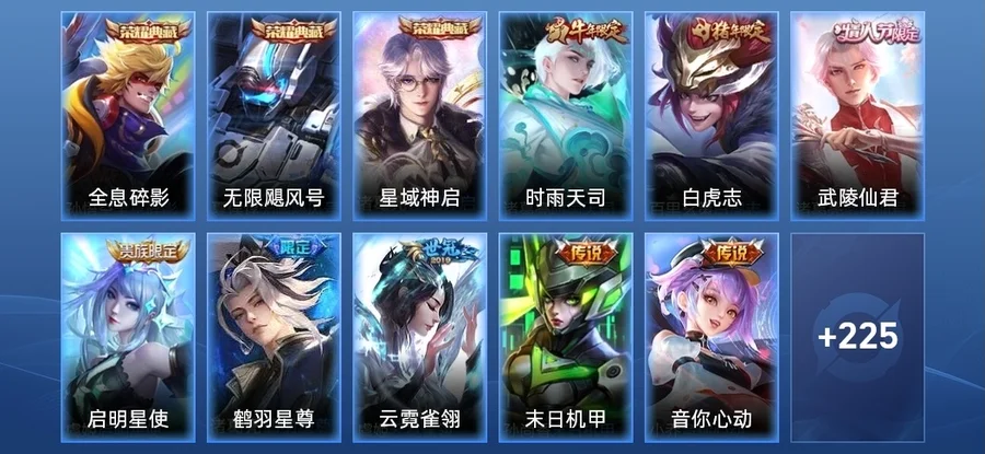 扁鵲-奇幻香蹤,暃-星界遊俠,馬可波羅-山海·玄木吟,夢奇-頑趣,鍾無豔-超時空戰士,元歌-無心,鬼谷子-五穀豐年,狂鐵-電玩高手,夏侯惇-匿光決鋒者,明世隱-吟遊魔法,公孫離-玉兔公主,黃忠-火炮紳士,雅典娜-黎明之約,雲中君-時之祈願,伽羅-天狼溯光者,米萊狄-胡桃異想國,馬可波羅-逐夢之星,關羽-冰鋒戰神,東皇太一-逐夢之光,元歌-雲間偶戲,干將莫邪-冰霜戀舞曲,呂布-御風驍將,百里玄策-原初追逐者,魯班七號-獅舞東方,蔡文姬-繁星吟遊,馬可波羅-暗影遊獵,典韋-藍色畫面警告,阿軻-迷蹤麗影,狄仁傑-魔術師,后羿-如夢令,趙雲-皇家上將