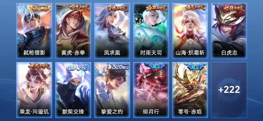 蒙恬-榮光聖徽,阿古朵-江河有靈,夢奇-頑趣,元歌-無心,百里玄策-原初追逐者,鬼谷子-五穀豐年,露娜-一生所愛,雅典娜-黎明之約,嬴政-優雅戀人,莊周-高山流水,豬八戒-豬悟能,馬超-神威,老夫子-航海奇遇記,韓信-逐夢之影,關羽-冰鋒戰神,元歌-雲間偶戲,干將莫邪-冰霜戀舞曲,花木蘭-默契交鋒,雲中君-纖雲弄巧,裴擒虎-李小龍,上官婉兒-天狼繪夢者,韓信-飛衡,曹操-天狼征服者,蔡文姬-繁星吟遊,蘭陵王-馴魔獵人,上官婉兒-梁祝,狄仁傑-魔術師,魯班七號-獅舞東方,趙雲-皇家上將,裴擒虎-天狼狩獵者,孫悟空-大聖娶親,嬴政-白晝王子