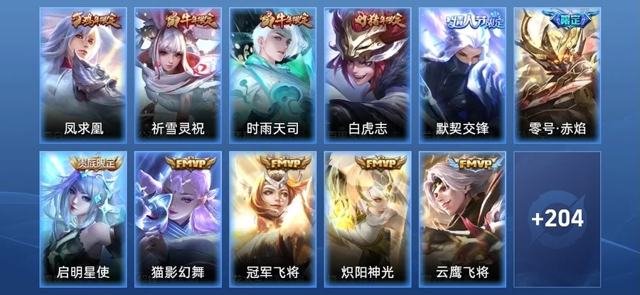 蘭陵王-默契交鋒,虞姬-啟明星使,公孫離-祈雪靈祝,諸葛亮-時雨天司,孫悟空-零號·赤焰,百里玄策-白虎志,李白-鳳求凰