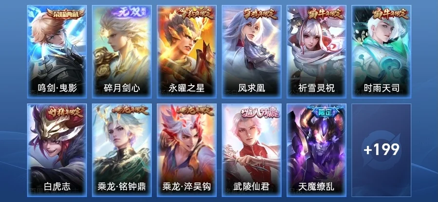 鬼谷子-五穀豐年,雅典娜-黎明之約,老夫子-航海奇遇記,大喬-白鶴梁神女,伽羅-天狼溯光者,百里玄策-原初追逐者,米萊狄-胡桃異想國,干將莫邪-冰霜戀舞曲,花木蘭-默契交鋒,項羽-霸王別姬,元歌-雲間偶戲,孫臏-天狼運算者,羋月-白晶晶,周瑜-真愛至上,韓信-逐夢之影,蔡文姬-繁星吟遊,雲中君-纖雲弄巧,花木蘭-青春決賽季,趙雲-皇家上將,馬超-神威,黃忠-烈魂,莊周-雲端築夢師,孫悟空-大聖娶親,趙雲-引擎之心,孫悟空-至尊寶,狄仁傑-魔術師,馬可波羅-逐夢之星,馬可波羅-暗影遊獵,裴擒虎-李小龍,蒙犽-狂想玩偶喵
