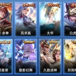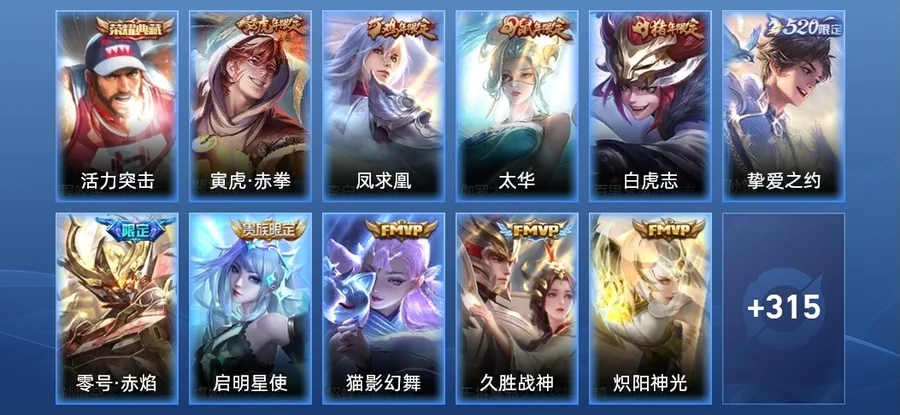 高漸離-燃音魔法,蒙恬-榮光聖徽,蒙犽-百解令,司空震-地獄燃心,阿古朵-江河有靈,戈婭-馭風魔法,暃-星界遊俠,扁鵲-奇幻香蹤,孫尚香-薔薇戀人,夢奇-頑趣,元歌-無心,鬼谷子-五穀豐年,狂鐵-電玩高手,明世隱-吟遊魔法,百里玄策-原初追逐者,公孫離-玉兔公主,黃忠-火炮紳士,楊玉環-寅虎·心曲,孫臏-寅虎·展翼,廉頗-寅虎·御盾,雅典娜-黎明之約,嫦娥-拒霜思,莊周-高山流水,干將莫邪-真愛魔法,馬超-神威,豬八戒-豬悟能,孫悟空-孫行者,公孫離-蜜橘之夏,伽羅-天狼溯光者,韓信-逐夢之影,老夫子-航海奇遇記,大喬-白鶴梁神女,米萊狄-胡桃異想國,馬可波羅-逐夢之星,元歌-雲間偶戲,花木蘭-默契交鋒,牛魔-奔雷神使,項羽-霸王別姬,孫臏-天狼運算者,雲中君-纖雲弄巧,蒙犽-狂想玩偶喵,裴擒虎-李小龍,馬可波羅-暗影遊獵,張飛-虎魄,黃忠-烈魂,李元芳-銀河之約,曹操-天狼征服者,蘭陵王-馴魔獵人,蔡文姬-繁星吟遊,上官婉兒-梁祝,魯班七號-獅舞東方,裴擒虎-天狼狩獵者,嬴政-白晝王子,狄仁傑-魔術師,孫悟空-大聖娶親,趙雲-皇家上將,楊玉環-遇見飛天,關羽-冰鋒戰神,甄姬-遊園驚夢
