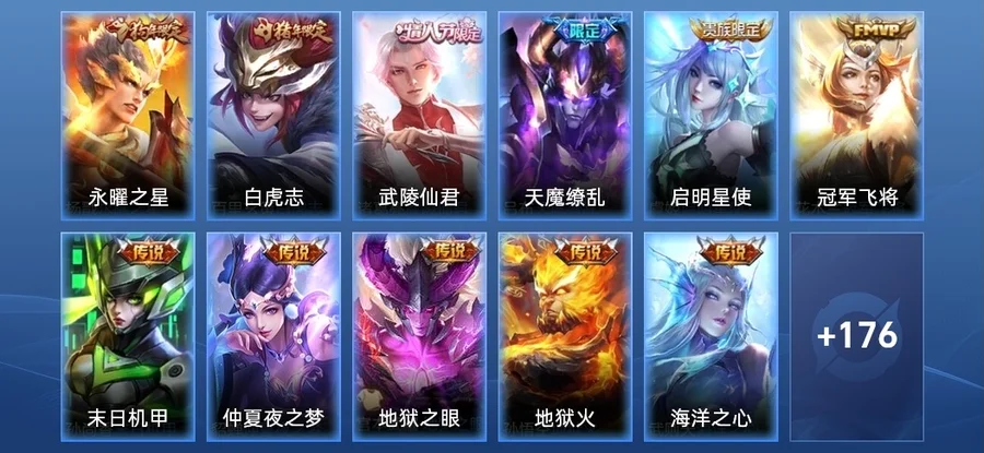 雅典娜-黎明之約,豬八戒-豬悟能,裴擒虎-李小龍,百里玄策-原初追逐者,東皇太一-逐夢之光,孫悟空-至尊寶,后羿-輝光之辰,典韋-藍色畫面警告,嬴政-白晝王子,孫悟空-大聖娶親,韓信-飛衡,干將莫邪-冰霜戀舞曲,公孫離-蜜橘之夏,花木蘭-青春決賽季,狄仁傑-魔術師,上官婉兒-梁祝,關羽-冰鋒戰神,莊周-雲端築夢師,趙雲-皇家上將,魯班七號-獅舞東方,楊玉環-遇見飛天