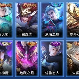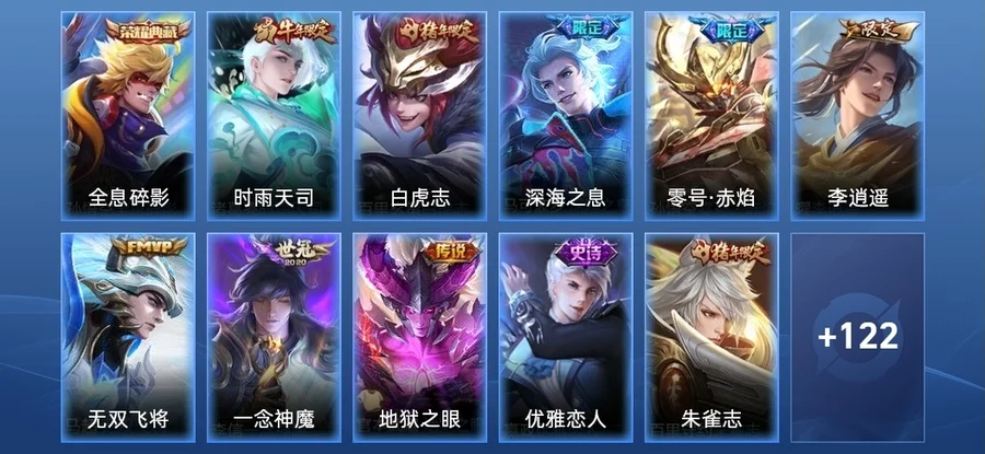 嬴政-優雅戀人,元歌-無心,鬼谷子-五穀豐年,裴擒虎-天狼狩獵者,狂鐵-電玩高手,明世隱-吟遊魔法,韓信-傲雪梅槍,嫦娥-拒霜思,莊周-高山流水,百里守約-朱雀志,馬超-神威,狄仁傑-魔術師,孫悟空-孫行者,趙雲-皇家上將,元歌-雲間偶戲,裴擒虎-李小龍