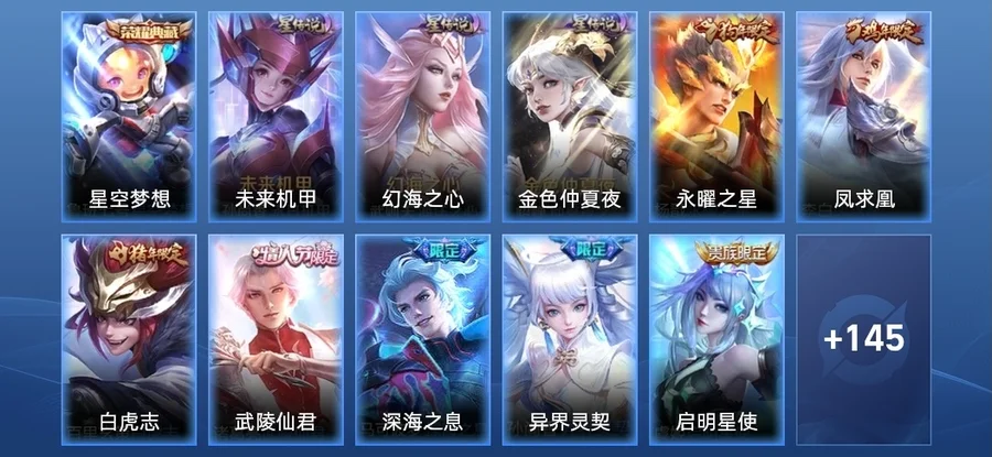 甄姬-冰雪圓舞曲,劉禪-秘密基地,扁鵲-救世之瞳,諸葛亮-星航指揮官,豬八戒-潮玩探月行,趙雲-嘻哈天王,趙雲-未來紀元,安琪拉-玩偶對對碰,墨子-龍騎士,小喬-丁香結,干將莫邪-第七人偶,米萊狄-契約魔法,桑啟-畫中遊,孫臏-天使之翼,妲己-女僕咖啡,孫尚香-水果甜心,姜子牙-熾熱元素使,墨子-金屬風暴,李信-灼熱之刃,阿軻-節奏熱浪,蘭陵王-暗隱獵獸者,大喬-貓狗日記,伽羅-箭羽風息,大喬-守護之力,孫策-貓狗日記,白起-星夜王子,楊玉環-霓裳曲,盾山-圓桌騎士,項羽-蒼穹之光,李元芳-逐浪之夏,小喬-繽紛獨角獸,蔡文姬-舞動綠茵,劉禪-天才門將,裴擒虎-梅西,呂布-末日機甲,曹操-死神來了,王昭君-偶像歌手,牛魔-制霸全明星,孫臏-未來旅行,鎧-曙光守護者,阿軻-愛心護理,甄姬-花好人間,老夫子-功夫老勺,雅典娜-冰冠公主,曹操-幽靈船長,弈星-踏雪尋梅,亞瑟-心靈戰警,關羽-龍騰萬里,關羽-天啟騎士,呂布-聖誕狂歡,馬可波羅-激情綠茵,鍾馗-地府判官,安琪拉-心靈駭客,王昭君-幻想奇妙夜,公孫離-花間舞,廉頗-地獄巖魂,夏侯惇-乘風破浪,姜子牙-時尚教父,劉邦-德古拉伯爵,小喬-萬聖前夜,程咬金-華爾街大亨,鍾無豔-海灘麗影,百里守約-絕影神槍,東皇太一-東海龍王,大喬-伊勢巫女,達摩-拳王,李元芳-黑貓愛糖果,露娜-紫霞仙子,貂蟬-聖誕戀歌,韓信-白龍吟,花木蘭-兔女郎,黃忠-芝加哥教父,妲己-魅力維加斯,妲己-少女阿狸,亞瑟-死亡騎士,趙雲-忍·炎影