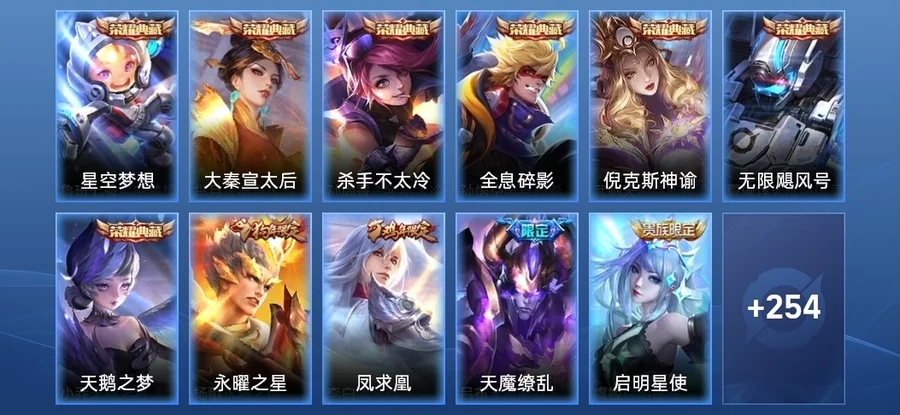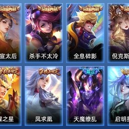 嬴政-搖滾巨星,弈星-踏雪尋梅,妲己-女僕咖啡,桑啟-畫中遊,甄姬-花好人間,亞瑟-心靈戰警,曹操-超能戰警,安琪拉-心靈駭客,張良-古海尋蹤,小喬-繽紛獨角獸,姬小滿-零食大作戰,劉禪-電玩·爆裂旋風,蘇烈-堅韌之力,豬八戒-潮玩探月行,海月-幻泉霧影,貂蟬-異域舞娘,夏侯惇-乘風破浪,蔡文姬-舞動綠茵,司空震-啟蟄,蒙恬-蔚藍守將,瑤-森,劉禪-喚靈魔甲,劉禪-天才門將,呂布-野性能量,楊玉環-霓裳曲,程咬金-無雙福將,魯班大師-歸虛夢演,女媧-尼羅河女神,鎧-龍域領主,狂鐵-特工戰影,孫策-海之征途,雲纓-赤焰之纓,阿古朵-熊喵少女,西施-歸虛夢演,大喬-守護之力,魯班大師-乓乓大師,百里守約-絕影神槍,墨子-龍騎士,張良-繽紛繪卷,牛魔-西部大鏢客,蒙恬-秩序獵龍將,劉禪-秘密基地,瀾-孤獵,項羽-職棒王牌,鏡-冰刃幻境,盾山-極冰防禦線,姜子牙-熾熱元素使,白起-星夜王子,橘右京-修羅,趙雲-忍·炎影,諸葛亮-掌控之力,花木蘭-兔女郎,盾山-圓桌騎士,沈夢溪-棒球奇才,宮本武藏-霸王丸,雲中君-荷魯斯之眼,達摩-大發明家,安琪拉-玩偶對對碰,司馬懿-魘語軍師,劉禪-英喵野望,王昭君-幻想奇妙夜,東皇太一-東海龍王,蒙犽-歸虛夢演,哪吒-次元突破,宮本武藏-未來紀元,呂布-末日機甲,莊周-鯉魚之夢,曜-歸虛夢演,伽羅-箭羽風息,宮本武藏-鬼劍武藏,狄仁傑-鷹眼統帥,盤古-創世神祝,廉頗-地獄巖魂,公孫離-花間舞,張飛-亂世虎臣,程咬金-功夫廚神,李信-灼熱之刃,雅典娜-冰冠公主,后羿-阿爾法小隊,孫策-貓狗日記,百里守約-特工魅影,沈夢溪-鯊炮海盜貓,狂鐵-命運角鬥場,馬超-倖存者,孫臏-歸虛夢演,典韋-黃金武士,項羽-蒼穹之光,劉邦-德古拉伯爵,宮本武藏-永珍初新,孫尚香-沉穩之力,干將莫邪-第七人偶,劉備-漢昭烈帝,鎧-曙光守護者,李元芳-逐浪之夏,元歌-午夜歌劇院,明世隱-虹雲星官,嫦娥-露花倒影,裴擒虎-街頭旋風,鬼谷子-幻樂之宴,關羽-天啟騎士,達摩-拳王,老夫子-功夫老勺,百里玄策-威尼斯狂歡,阿軻-致命風華,夢奇-美夢成真,花木蘭-水晶獵龍者,蘇烈-愛與和平,扁鵲-化身博士,蘭陵王-暗隱獵獸者,鍾無豔-海灘麗影,鬼谷子-阿摩司公爵,張良-一千零一夜,劉備-紐約教父,鍾馗-地府判官,太乙真人-圓桌騎士,程咬金-星際陸戰隊,張飛-五福同心,貂蟬-聖誕戀歌,大喬-伊勢巫女,李元芳-特種部隊,周瑜-海軍大將,老夫子-潮流仙人,小喬-萬聖前夜,馬可波羅-激情綠茵,黃忠-芝加哥教父,阿軻-暗夜貓娘,趙雲-嘻哈天王,王昭君-精靈公主,雅典娜-戰爭女神,曹操-死神來了,呂布-聖誕狂歡,曹操-幽靈船長,嬴政-暗夜貴公子,白起-白色死神,劉邦-聖殿之光,阿軻-愛心護理,諸葛亮-星航指揮官,趙雲-未來紀元,孫尚香-水果甜心,孫悟空-西部大鏢客,關羽-龍騰萬里,夏侯惇-戰爭騎士,李白-千年之狐,哪吒-三太子,韓信-白龍吟,露娜-紫霞仙子,鍾無豔-生化警戒,韓信-街頭霸王,王昭君-偶像歌手,趙雲-白執事,蘭陵王-隱刃,楊戩-埃及法老,韓信-教廷特使,成吉思汗-維京掠奪者,魯班七號-福祿兄弟,露娜-緋紅之刃,后羿-精靈王,墨子-金屬風暴,妲己-魅力維加斯,妲己-少女阿狸,亞瑟-死亡騎士