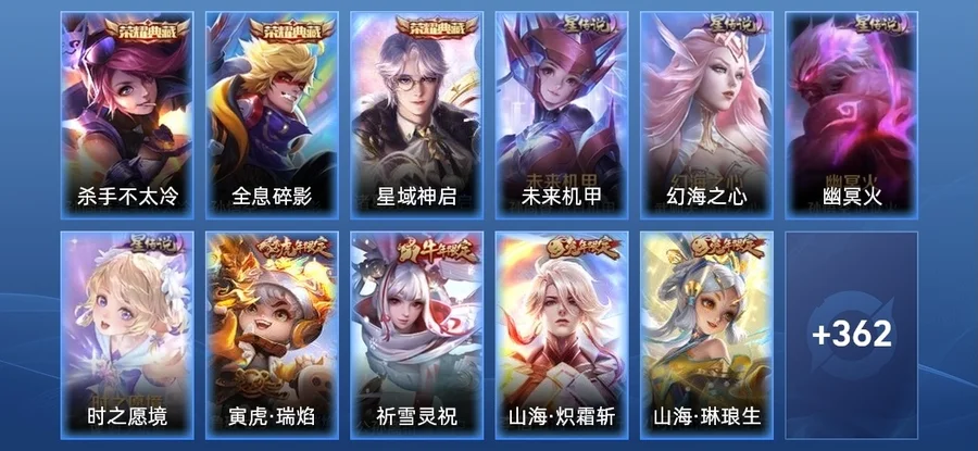張良-古海尋蹤,姬小滿-零食大作戰,萊西奧-西部遊俠,太乙真人-勁辣紅鍋,楊玉環-銀翎春語,趙懷真-太極少年,白起-樂園追獵者,韓信-街頭霸王,安琪拉-心靈駭客,牛魔-牛運亨通,豬八戒-潮玩探月行,海月-幻泉霧影,百里玄策-威尼斯狂歡,劉禪-紳士熊喵,花木蘭-水晶獵龍者,劉備-潮玩造夢師,鍾無豔-生化警戒,戈婭-危途狂花,瀾-賞金獵手,露娜-紫霞仙子,蒙恬-蔚藍守將,蒙犽-胡桃狂想曲,鬼谷子-阿摩司公爵,鎧-龍域領主,白起-白色死神,劉禪-英喵野望,露娜-緋紅之刃,哪吒-三太子,魯班七號-木偶奇遇記,米萊狄-契約魔法,桑啟-畫中遊,夏洛特-永晝,蒙犽-龍鼓爭鳴,關羽-天啟騎士,暃-碧珀緋影,東皇太一-東海龍王,蘭陵王-隱刃,魯班七號-福祿兄弟,夏侯惇-戰爭騎士,曹操-超能戰警,司馬懿-暗淵魔法,李白-範海辛,大喬-貓狗日記,孫尚香-沉穩之力,劉邦-虎嘯劍宗,狄仁傑-錦衣衛,程咬金-無雙福將,孫策-海之征途,米萊狄-精準探案法,狂鐵-命運角鬥場,馬可波羅-潮玩牛仔,李白-敏銳之力,金蟬-前塵,狂鐵-特工戰影,張良-一千零一夜,瑤-遇見神鹿,劉邦-聖殿之光,妲己-紫羅蘭之誓,羋月-紅桃皇后,王昭君-精靈公主,妲己-女僕咖啡,扁鵲-救世之瞳,娜可露露-晚螢,小喬-萬聖前夜,盾山-極冰防禦線,阿軻-暗夜貓娘,魯班大師-乓乓大師,雲纓-赤焰之纓,項羽-帝國元帥,花木蘭-劍舞者,李元芳-特種部隊,女媧-尼羅河女神,楊玉環-霓裳曲,項羽-蒼穹之光,孫臏-天使之翼,張良-繽紛繪卷,露娜-瓷語鑑心,墨子-金屬風暴,張飛-亂世虎臣,老夫子-潮流仙人,楊戩-次元傲視,劉禪-秘密基地,太乙真人-圓桌騎士,司空震-啟蟄,瀾-孤獵,不知火舞-魅語,甄姬-冰雪圓舞曲,雅典娜-戰爭女神,劉備-萬事如意,魯班大師-歸虛夢演,蔡文姬-舞動綠茵,姜子牙-熾熱元素使,廉頗-無盡征程,橘右京-修羅,甄姬-花好人間,阿古朵-熊喵少女,曜-歸虛夢演,蒙恬-秩序獵龍將,高漸離-金屬狂潮,諸葛亮-掌控之力,孫尚香-時之戀人,墨子-龍騎士,盾山-圓桌騎士,虞姬-加勒比小姐,趙雲-忍·炎影,鏡-冰刃幻境,伽羅-箭羽風息,趙雲-未來紀元,盤古-創世神祝,楊戩-埃及法老,西施-歸虛夢演,成吉思汗-維京掠奪者,后羿-阿爾法小隊,達摩-大發明家,露娜-哥特玫瑰,魯班七號-黑桃隊長,哪吒-次元突破,蒙犽-歸虛夢演,亞瑟-心靈戰警,程咬金-星際陸戰隊,蔡文姬-薔薇王座,程咬金-功夫廚神,馬超-倖存者,沈夢溪-鯊炮海盜貓,孫臏-歸虛夢演,典韋-黃金武士,狄仁傑-鷹眼統帥,大喬-守護之力,呂布-野性能量,孫尚香-水果甜心,雲中君-荷魯斯之眼,小喬-丁香結,曹操-幽靈船長,蘇烈-堅韌之力,裴擒虎-梅西,瑤-森,夢奇-美夢成真,姜子牙-時尚教父,莊周-奇妙博物學,宮本武藏-未來紀元,阿軻-愛心護理,嬴政-搖滾巨星,牛魔-西部大鏢客,張良-幽蘭居士,貂蟬-聖誕戀歌,蘇烈-愛與和平,孫臏-未來旅行,鍾馗-地府判官,司馬懿-魘語軍師,明世隱-虹雲星官,豬八戒-年年有餘,孫策-貓狗日記,弈星-踏雪尋梅,大喬-伊勢巫女,嫦娥-露花倒影,孫尚香-火炮千金,妲己-仙境愛麗絲,劉禪-天才門將,程咬金-華爾街大亨,張良-天堂福音,宮本武藏-永珍初新,上官婉兒-修竹墨客,黃忠-芝加哥教父,李信-灼熱之刃,項羽-科學大爆炸,干將莫邪-第七人偶,廉頗-地獄巖魂,沈夢溪-棒球奇才,小喬-繽紛獨角獸,魯班七號-電玩小子,李白-千年之狐,公孫離-花間舞,貂蟬-異域舞娘,安琪拉-如懿,王昭君-偶像歌手,宮本武藏-鬼劍武藏,張飛-五福同心,裴擒虎-街頭旋風,阿軻-節奏熱浪,元歌-午夜歌劇院,伽羅-花見巫女,白起-星夜王子,安琪拉-玩偶對對碰,項羽-職棒王牌,劉備-漢昭烈帝,趙雲-白執事,關羽-龍騰萬里,達摩-拳王,劉邦-德古拉伯爵,花木蘭-兔女郎,曹操-死神來了,百里守約-特工魅影,鬼谷子-幻樂之宴,李元芳-逐浪之夏,墨子-進擊墨子號,鎧-曙光守護者,蘭陵王-暗隱獵獸者,明世隱-占星師,韓信-白龍吟,夏侯惇-乘風破浪,后羿-精靈王,馬可波羅-激情綠茵,呂布-聖誕狂歡,牛魔-制霸全明星,老夫子-功夫老勺,百里守約-絕影神槍,王昭君-幻想奇妙夜,雅典娜-冰冠公主,宮本武藏-霸王丸,阿軻-致命風華,孫悟空-西部大鏢客,韓信-教廷特使,扁鵲-化身博士,鍾無豔-海灘麗影,妲己-魅力維加斯,周瑜-海軍大將,諸葛亮-星航指揮官,劉備-紐約教父,妲己-少女阿狸,亞瑟-死亡騎士