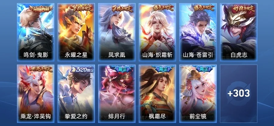 孫策-乘龍·淬吳鉤,呂布-遇見神鼓,關羽-武聖,馬可波羅-妄想實況,諸葛亮-鶴羽星尊,李白-鳳求凰,楊戩-永曜之星,李信-山海·熾霜斬,孫悟空-齊天大聖,曜-山海·蒼雷引,不知火舞-緋月行,娜可露露-前塵鏡,橘右京-楓霜盡,馬可波羅-深海之息,后羿-無盡星芒,虞姬-啟明星使,孫策-摯愛之約,孫悟空-零號·赤焰,百里玄策-白虎志